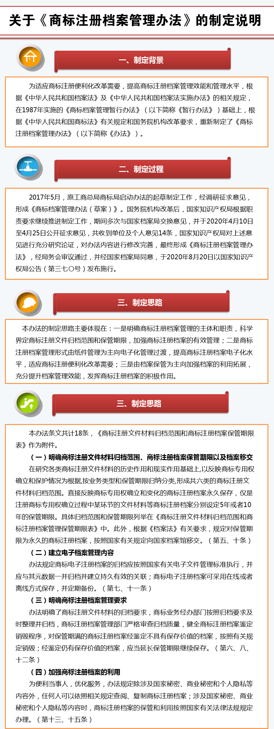 2017年5月,原工商總局商標局啟動辦法的起草制定工作,經調研征求意見,形成《商標檔案管理辦法(草案)》。國務院機構改革后,國家知識產權局根據職責要求繼續推進制定工作,期間多次與國家檔案局交換意見,并于2020年4月10日至4月25日公開征求意見,共收到單位及個人意見14條,國家知識產權局對上述意見進行充分研究論證,對辦法內容進行修改完善,最終形成《商標注冊檔案管理辦法》,經局務會審議通過,并經國家檔案局同意,于2020年8月20日以國家知識產權局公告(第三七〇號)發布施行。