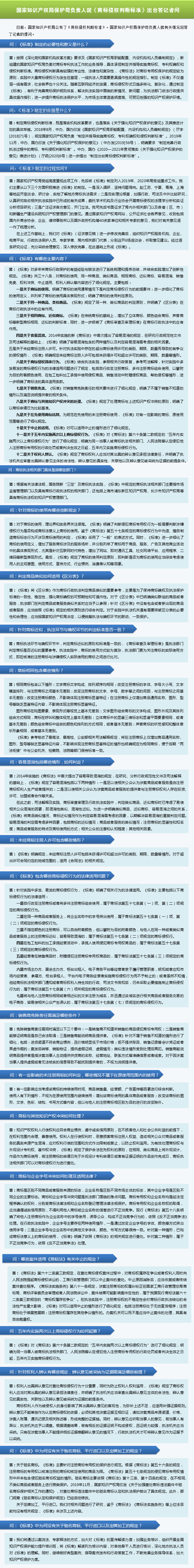 答:制定商標(biāo)侵權(quán)判斷標(biāo)準(zhǔn),既是落實(shí)機(jī)構(gòu)改革要求,也是落實(shí)《關(guān)于強(qiáng)化知識(shí)產(chǎn)權(quán)保護(hù)的意見》及其推進(jìn)計(jì)劃的具體舉措。2018年8月,中辦、國辦印發(fā)《國家知識(shí)產(chǎn)權(quán)局職能配置、內(nèi)設(shè)機(jī)構(gòu)和人員編制規(guī)定》(廳字[2018]71號(hào)),規(guī)定國家知識(shí)產(chǎn)權(quán)局負(fù)責(zé)“制定并指導(dǎo)實(shí)施商標(biāo)權(quán)、專利權(quán)確權(quán)和侵權(quán)判斷標(biāo)準(zhǔn)”。2019年11月,中辦、國辦印發(fā)《關(guān)于強(qiáng)化知識(shí)產(chǎn)權(quán)保護(hù)的意見》(中辦發(fā)[2019]56號(hào)),明確要求“制定完善行政執(zhí)法過程中的商標(biāo)、專利侵權(quán)判斷標(biāo)準(zhǔn)”。中辦、國辦《2020—2021年貫徹落實(shí)〈關(guān)于強(qiáng)化知識(shí)產(chǎn)權(quán)保護(hù)的意見〉推進(jìn)計(jì)劃》(廳函[2020]6號(hào))進(jìn)一步提出“制定出臺(tái)商標(biāo)侵權(quán)判斷標(biāo)準(zhǔn)”。
