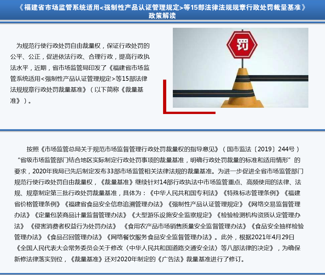 為規范行使行政處罰自由裁量權,保證行政處罰的公平、公正,促進依法行政、合理行政,提高行政執法水平,近期,省市場監管局印發了《福建省市場監管系統適用<強制性產品認證管理規定>等15部法律法規規章行政處罰裁量基準》(以下簡稱《裁量基準》)。