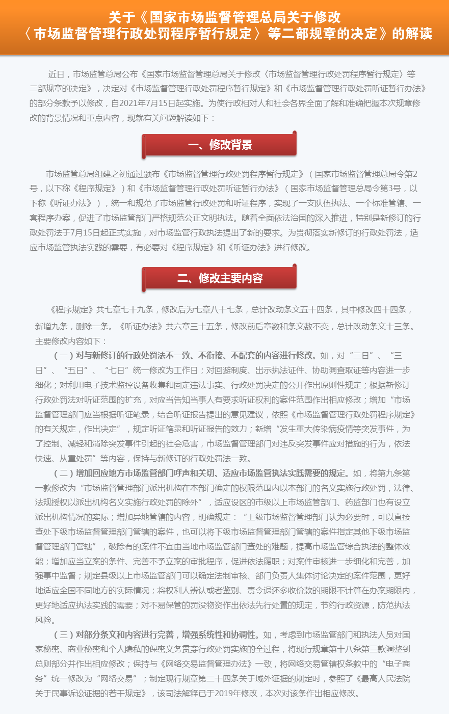 近日,市場(chǎng)監(jiān)管總局公布《國(guó)家市場(chǎng)監(jiān)督管理總局關(guān)于修改〈市場(chǎng)監(jiān)督管理行政處罰程序暫行規(guī)定〉等二部規(guī)章的決定》,決定對(duì)《市場(chǎng)監(jiān)督管理行政處罰程序暫行規(guī)定》和《市場(chǎng)監(jiān)督管理行政處罰聽證暫行辦法》的部分條款予以修改,自2021年7月15日起實(shí)施。為使行政相對(duì)人和社會(huì)各界全面了解和準(zhǔn)確把握本次規(guī)章修改的背景情況和重點(diǎn)內(nèi)容,現(xiàn)就有關(guān)問(wèn)題解讀如下: