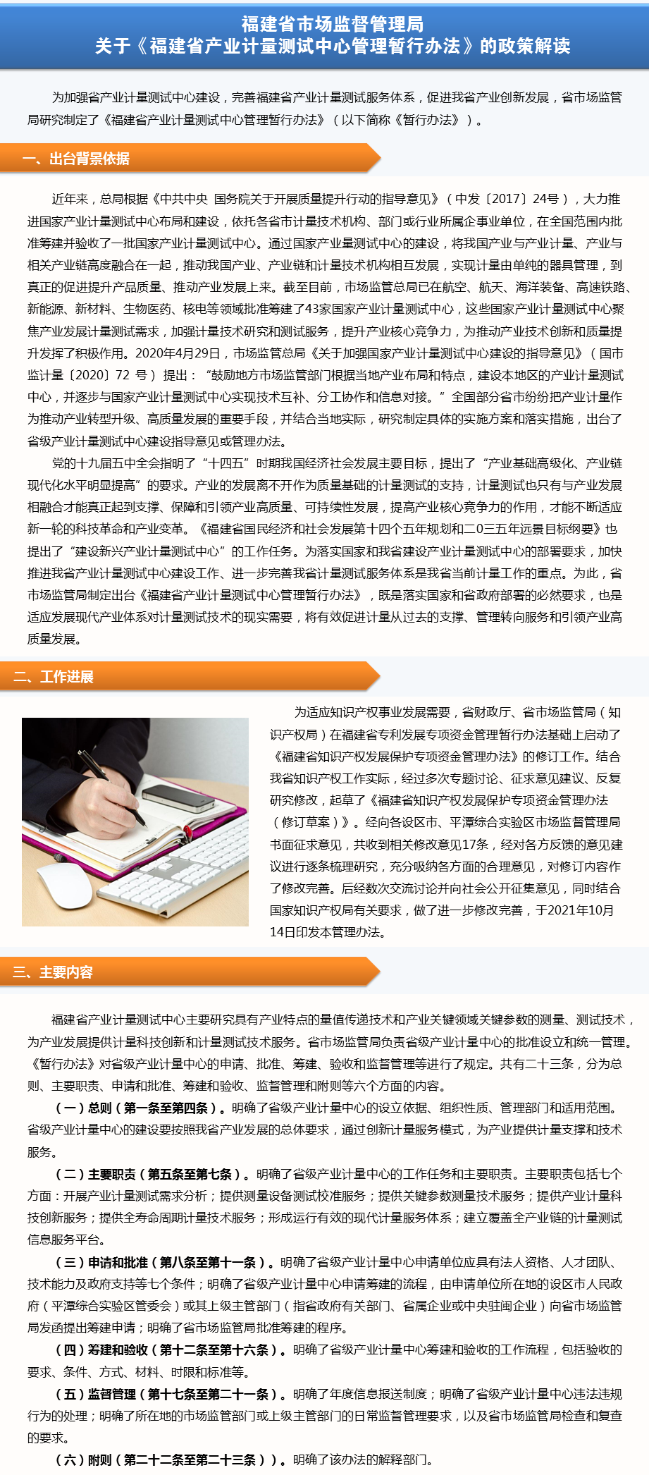 為加強省產業計量測試中心建設,完善福建省產業計量測試服務體系,促進我省產業創新發展,省市場監管局研究制定了《福建省產業計量測試中心管理暫行辦法》(以下簡稱《暫行辦法》)。