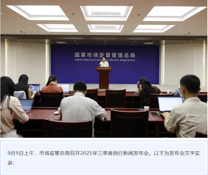 各位記者朋友、各位來賓,大家上午好!初秋的北京,九三盛大閱兵活動剛剛落下帷幕。銘記歷史,傳承薪火。磅礴奮進,砥礪前行。今天,我們相聚于此,共同參加市場監管總局2025年第三季度例行新聞發布會。