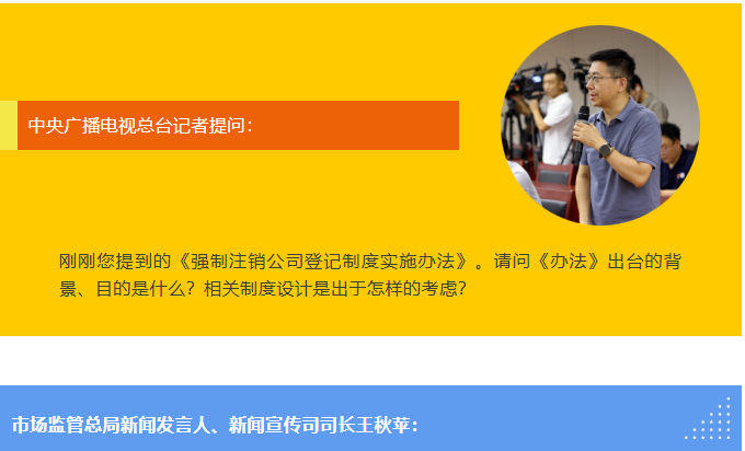 我們剛出臺的《辦法》,就是把法律要求轉化為可操作、可執行、能落地的實踐指南,旨在加快市場新陳代謝,清理名存實亡的“僵尸企業”,優化市場生態,護航公平競爭。