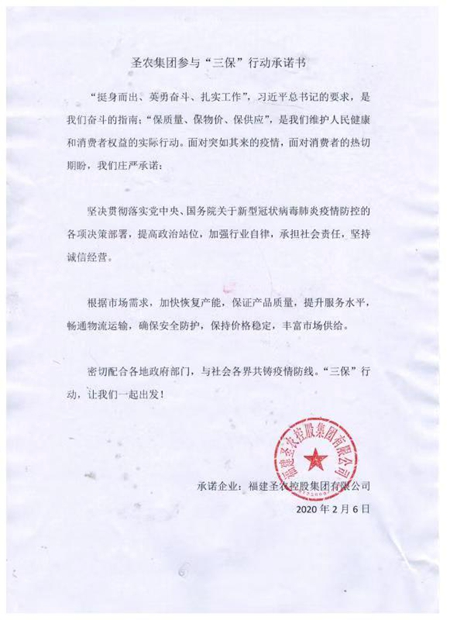 福建圣農控股集團有限公司參與“三保”行動承諾書