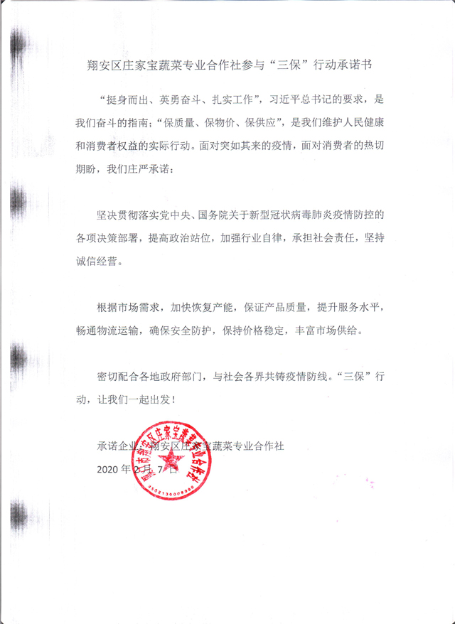 翔安區(qū)莊家寶蔬菜專業(yè)合作社參與“三保”行動承諾書