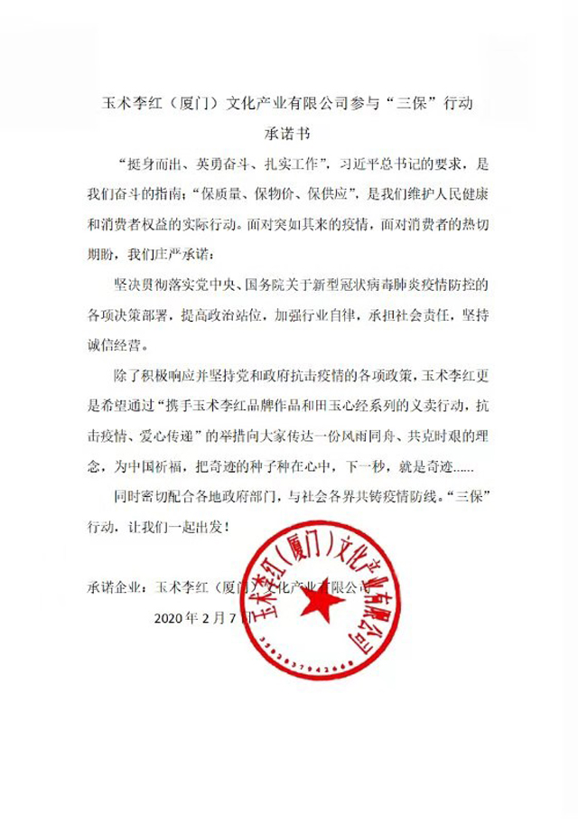 玉術李紅(廈門)文化產業有限公司參與“三保”行動承諾書
