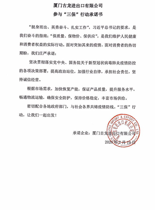 廈門古龍進出口有限公司參與“三保”行動承諾書