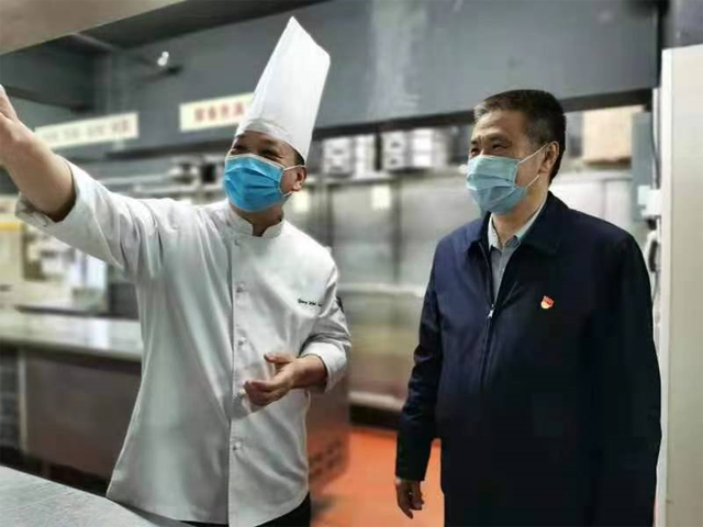 檢查組一行先后前往東街口聚春園大酒店、富黎華海鮮大酒樓(正大廣場店),對餐飲服務單位的后廚衛生、食品留樣、從業人員佩戴口罩等情況進行檢查。