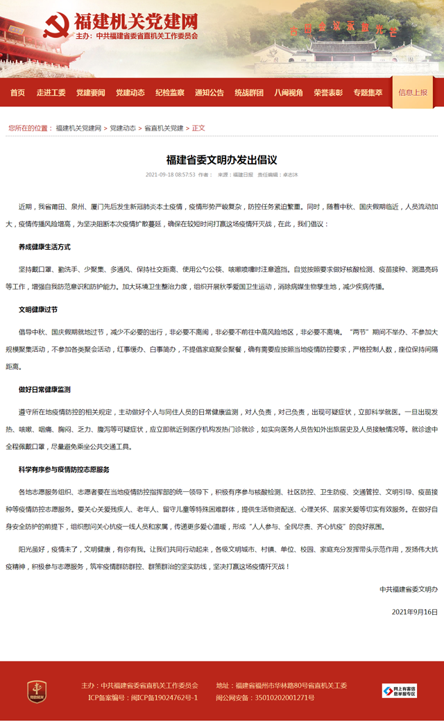 近期,我省莆田、泉州、廈門先后發生新冠肺炎本土疫情,疫情形勢嚴峻復雜,防控任務緊迫繁重。同時,隨著國慶假期臨近,人員流動加大,疫情傳播風險增高,為堅決阻斷本次疫情擴散蔓延,確保在較短時間打贏這場疫情殲滅戰,在此,我們倡議: