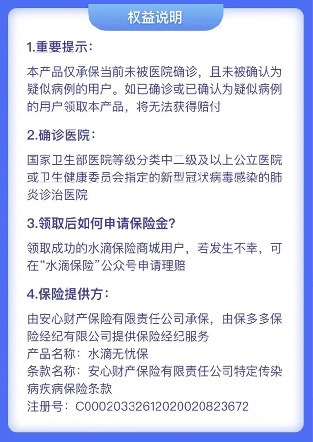 免費!本保障為公益屬性,您不需要繳納任何費用,每人免費限領1份,領取次日生效。承保被保險人在等待期(5天)后經醫院初次確診罹患新型冠狀病毒感染的肺炎,并達到《新型冠狀病毒感染肺炎的診療方案(試行第五版)》中“臨床分型”所規定的分型時,將按照保險合同第一時間給予賠付。