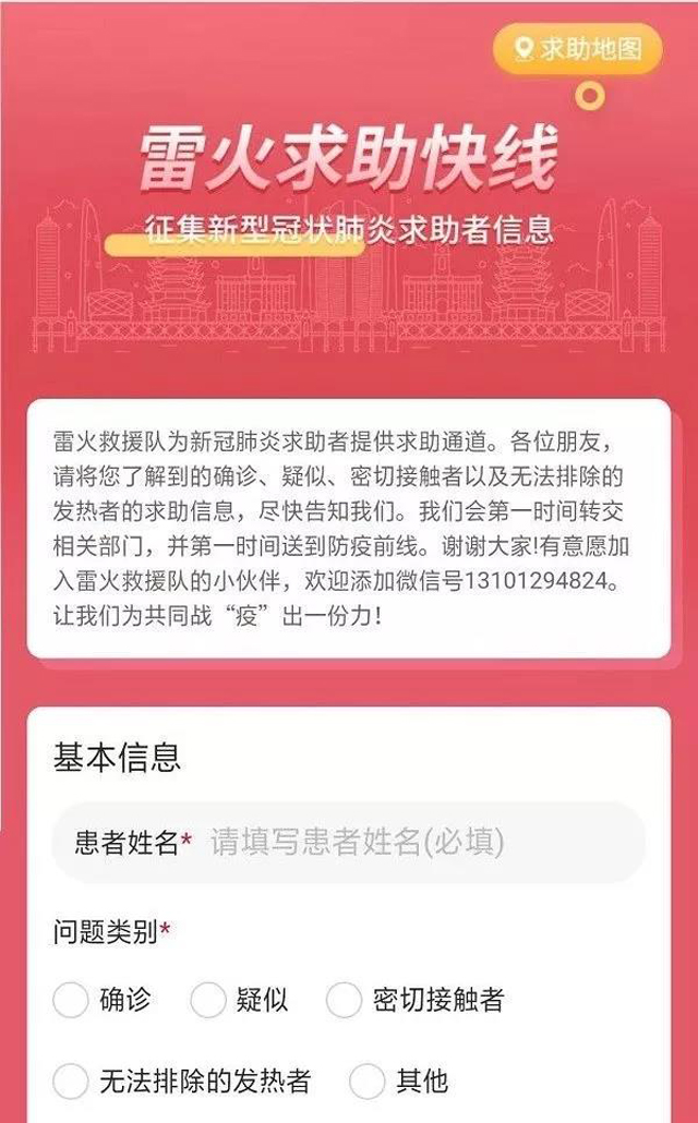 “雷火救助快線”為新冠肺炎求助者增設一條求助渠道。疫情爆發以來,大量身處疫情風暴中心的武漢市民通過社交媒體對外求助,大批社會志愿力量也紛紛伸出援手參與救助行動。“雷火救助快線”版塊便是雷火救援隊為求助者提供的一條求助通道。求助者可通過填寫表格提交求助信息,志愿者會第一時間轉交相關部門并提供支援。