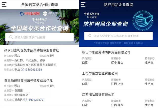 “防護用品查詢”和“蔬菜合作社查詢”幫助有關部門及時采購所需物資。目前,防護物資緊缺已經成為這場“戰疫”最大的阻礙,多家醫療機構發出防護物資求助請求;受限于交通管制,菜蔬等生活物資的供給也相對緊缺。這兩個版塊能夠為口罩、防護服、護目鏡等防護用品生產廠家和蔬菜合作社的查詢提供一個線上入口,方便群眾和戰斗在防疫一線的工作者快速聯系到生產廠商,進行物資的采購。