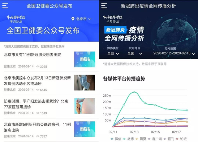 “衛健委公號發布”和“疫情全網傳播”梳理重點信息及全網傳播分析。疫情防控期間,重點信息的及時公開至關重要,衛健委對外發布的信息成為民眾關注的焦點,“衛健委公號發布”版塊可即時查看全國衛健委公號發布的內容,并可具體定位到每一個市;“疫情全網傳播”版塊則通過可視化圖表的形式呈現“新冠肺炎”相關信息在全網各平臺的傳播走勢、發布情況,幫助用戶把握疫情信息傳播的整體態勢。