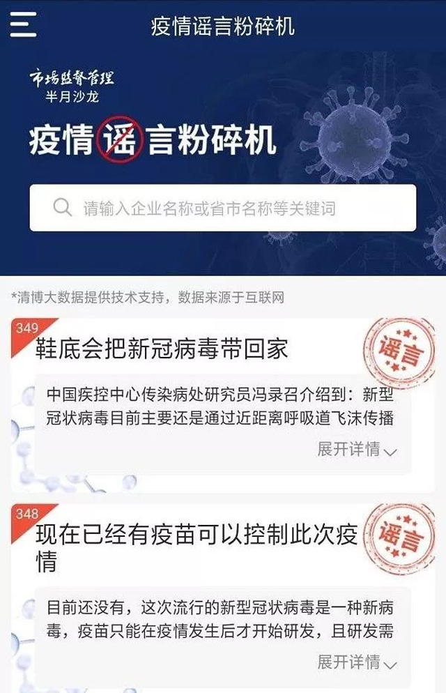 “防疫謠言粉碎機”在謠言初期就將其扼殺在萌芽中。眼下,關于新冠肺炎的各類謠言漫天,該版塊綜合了媒體和專業機構以及專業人士已辟謠的相關信息,可有效為群眾提供有效辟謠信息,穩定群眾情緒,減少群眾恐慌;同時,通過科學辟謠,也能夠降低因謠言引起的不必要的防疫物資搶購熱潮。
