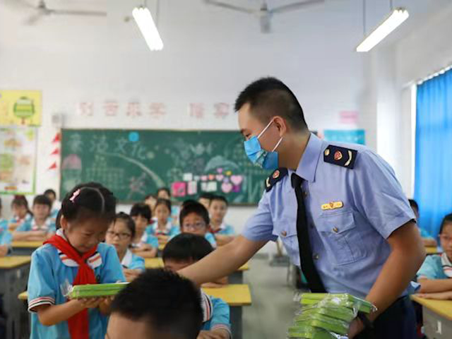 10月11日上午,福州市倉山區金港灣實驗學校三年三班的孩子們收獲頗豐,不僅“富了腦袋”——增長了食品安全科普小知識,也“富了口袋”——收到了市場監管局的“藍衣衛士們”分發的食安創城宣傳口罩、鉛筆盒等小禮物。