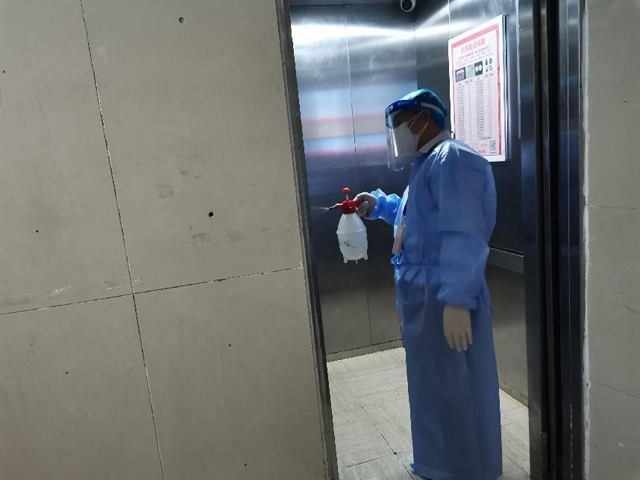李忠平在消毒電梯