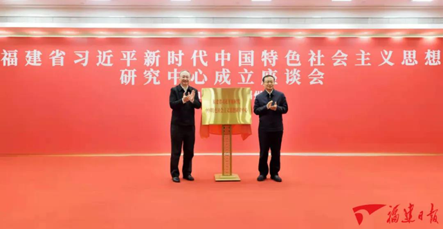 隨后,省委常委同志集體出席福建省習近平新時代中國特色社會主義思想研究中心揭牌儀式和座談會。尹力、孫業禮共同為研究中心揭牌并為學術委員會委員代表頒發聘書。