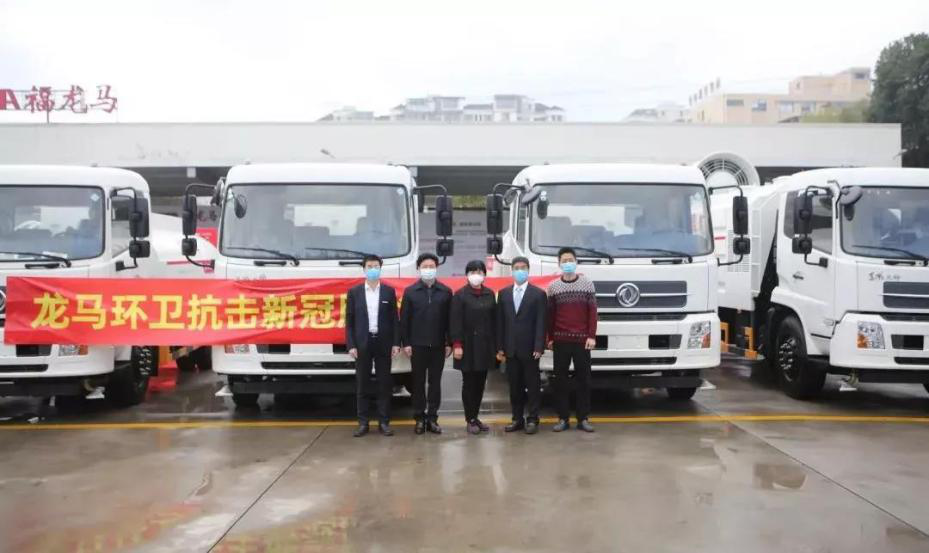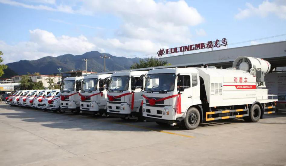捐贈(zèng)的18臺(tái)“福龍馬”牌環(huán)衛(wèi)消毒專(zhuān)用車(chē)整裝待發(fā)