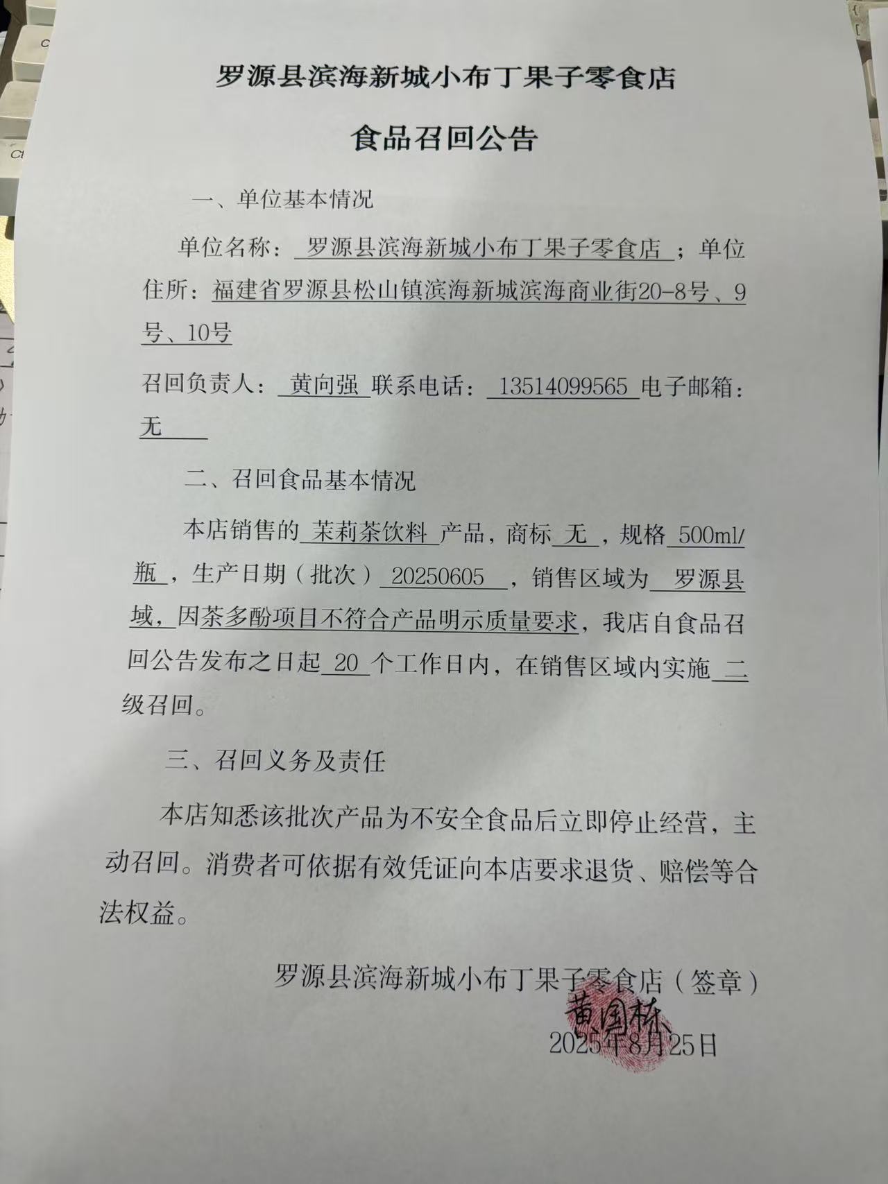 羅源縣濱海新城小布丁果子零食店食品召回公告(20250825)