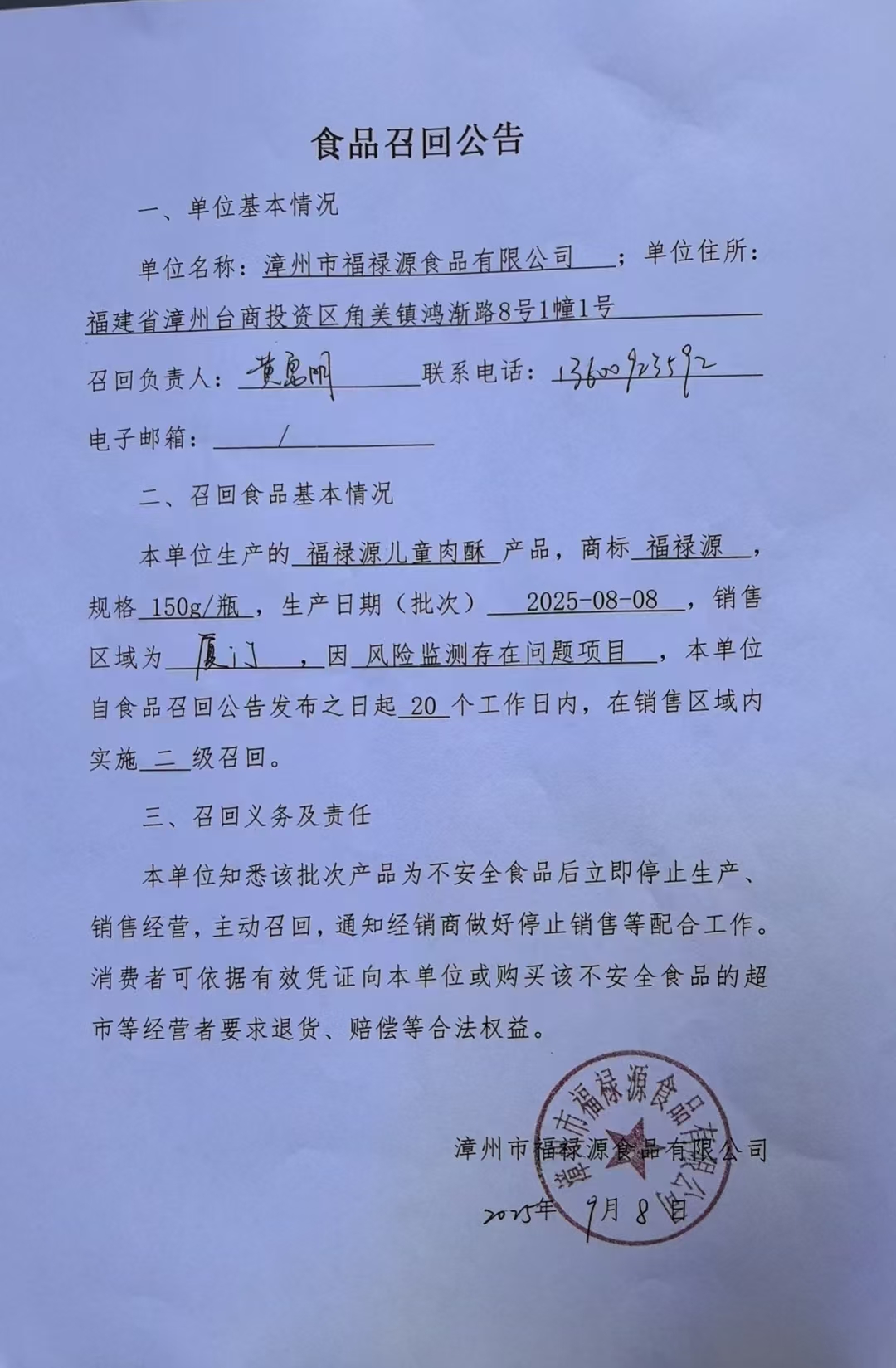 漳州市福祿源食品有限公司食品召回公告(20250908)