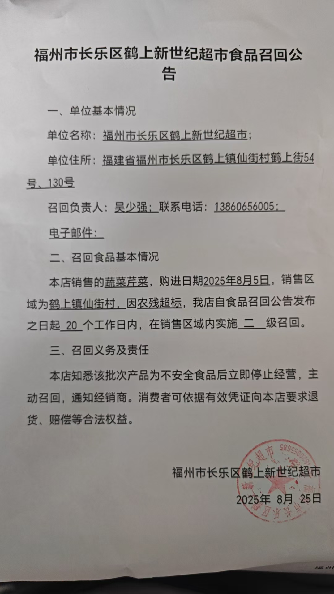 福州市長樂區鶴上新世紀超市食品召回公告(20250825)