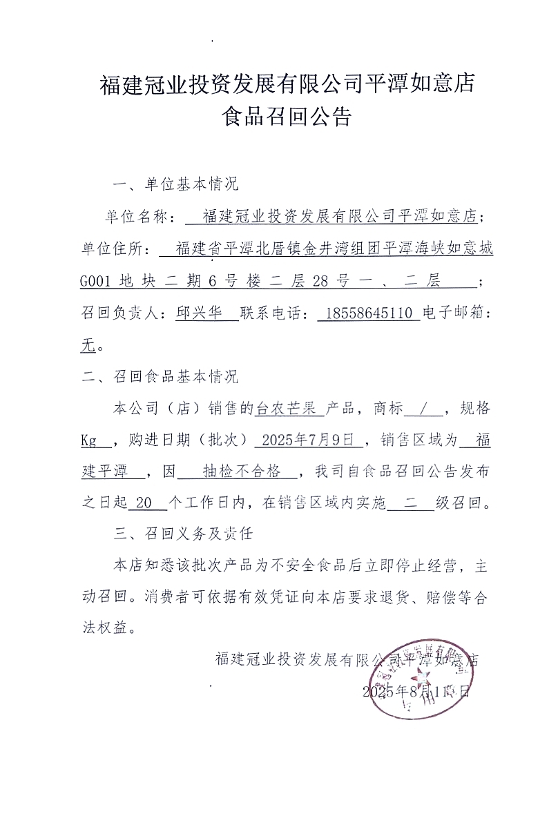 福建冠業投資發展有限公司平潭如意店食品召回公告(臺農芒果)(20250811)