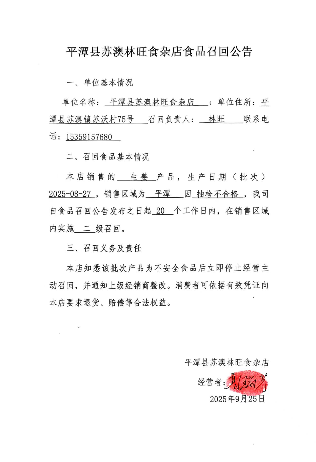平潭蘇澳林旺食雜店食品召回公告(20250925)
