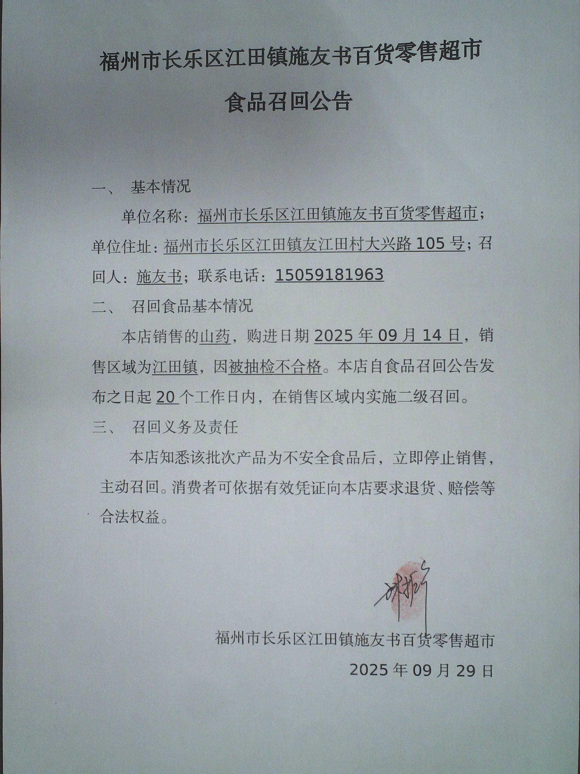 福州市長樂區江田鎮施友書百貨零售超市食品召回公告(20250929)