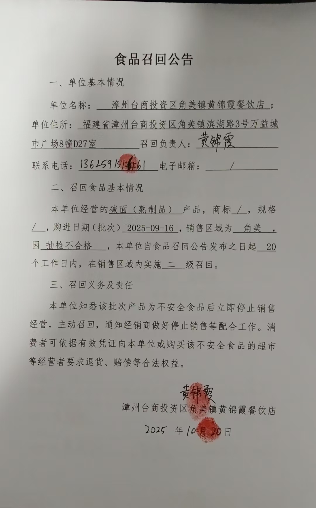 漳州臺商投資區角美鎮黃錦霞餐飲店食品召回公告(堿面熟制品)(20251020)
