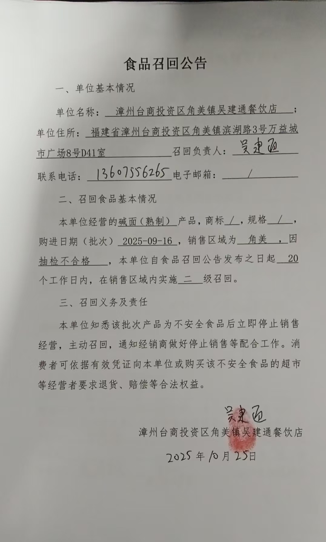 漳州臺商投資區角美鎮吳建通餐飲店食品召回公告(20251025)