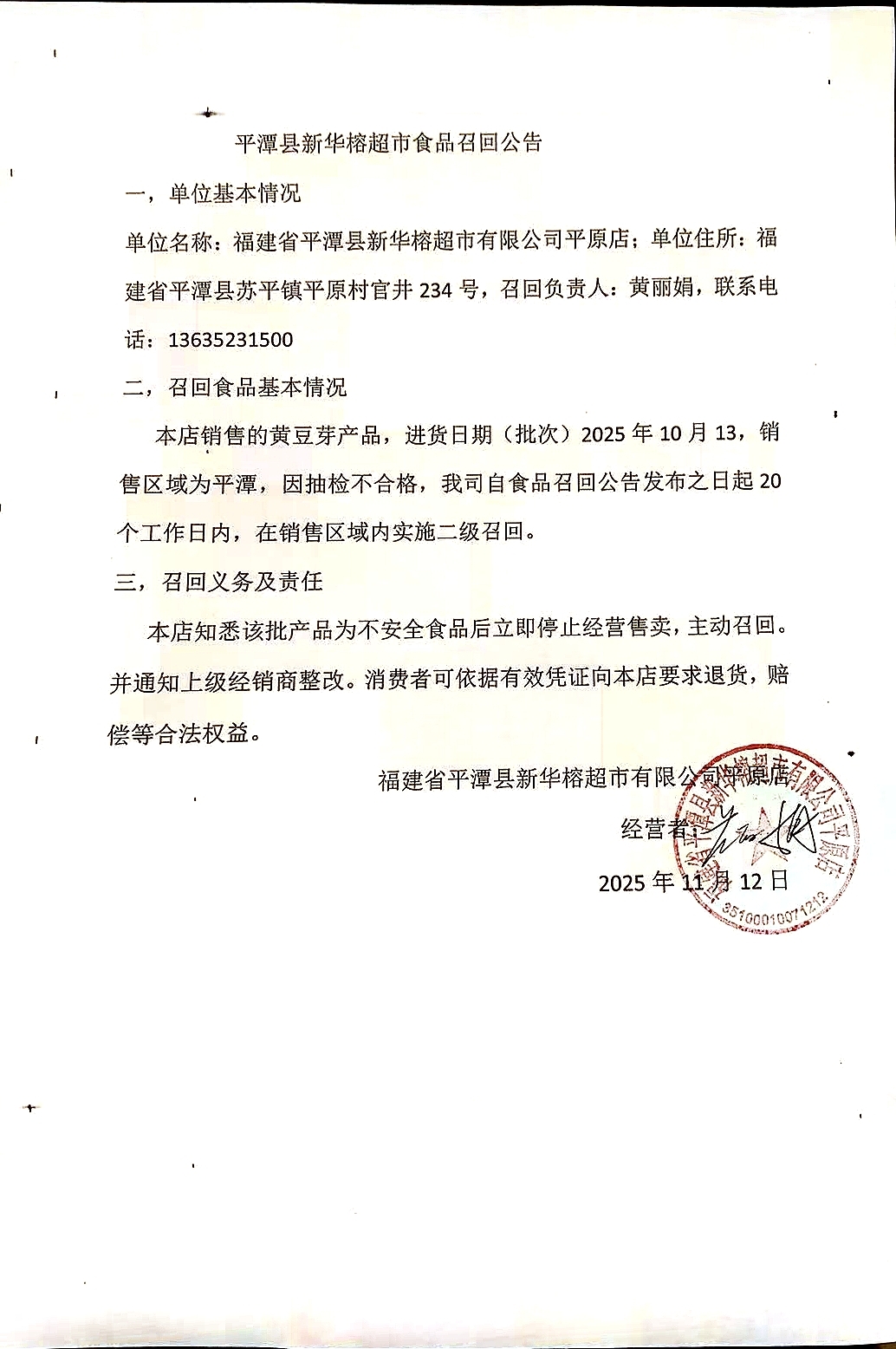 福建省平潭縣新華榕超市有限公司平原店食品召回公告(20251112)