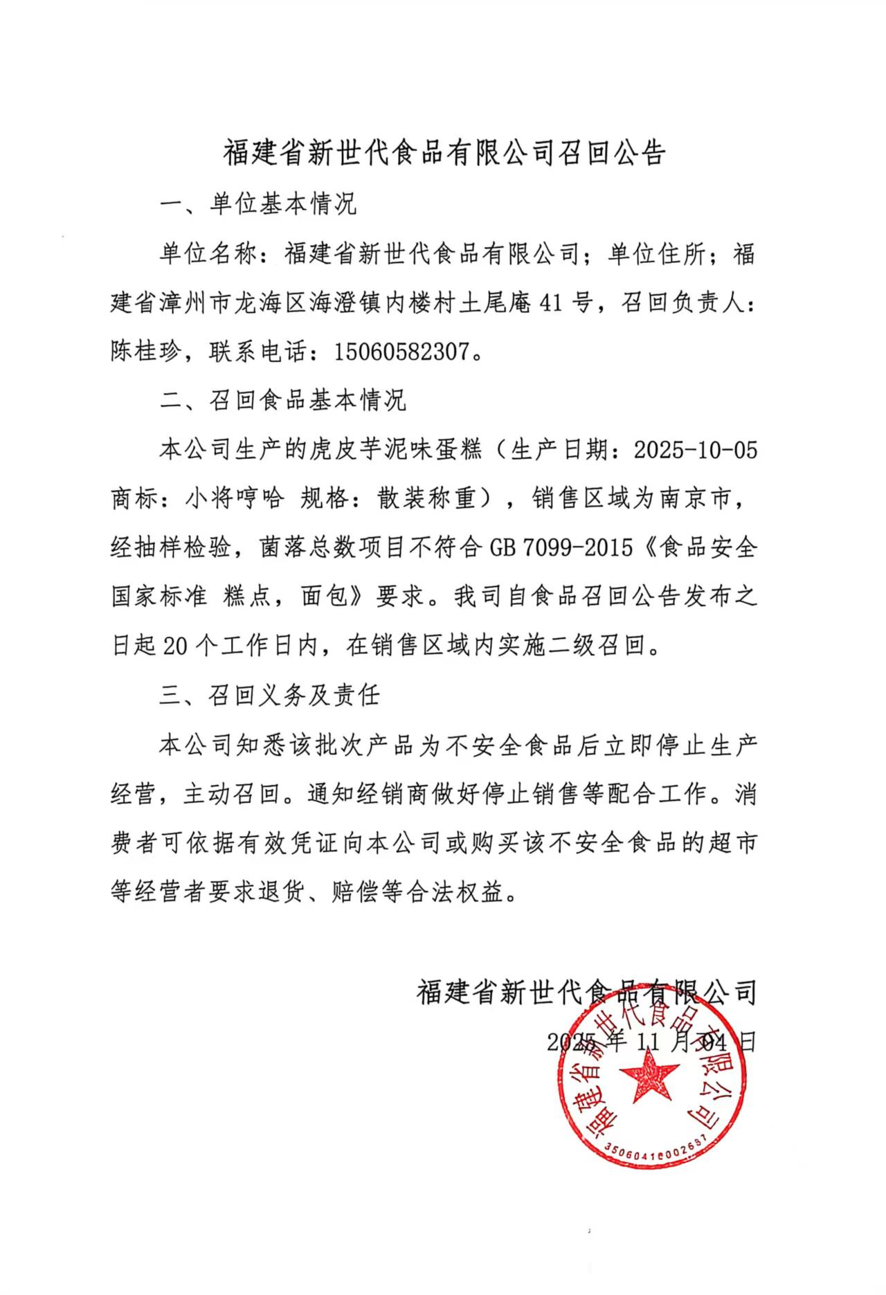福建省新世代食品有限公司食品召回公告(虎皮芋泥味蛋糕20251005)(20251104)