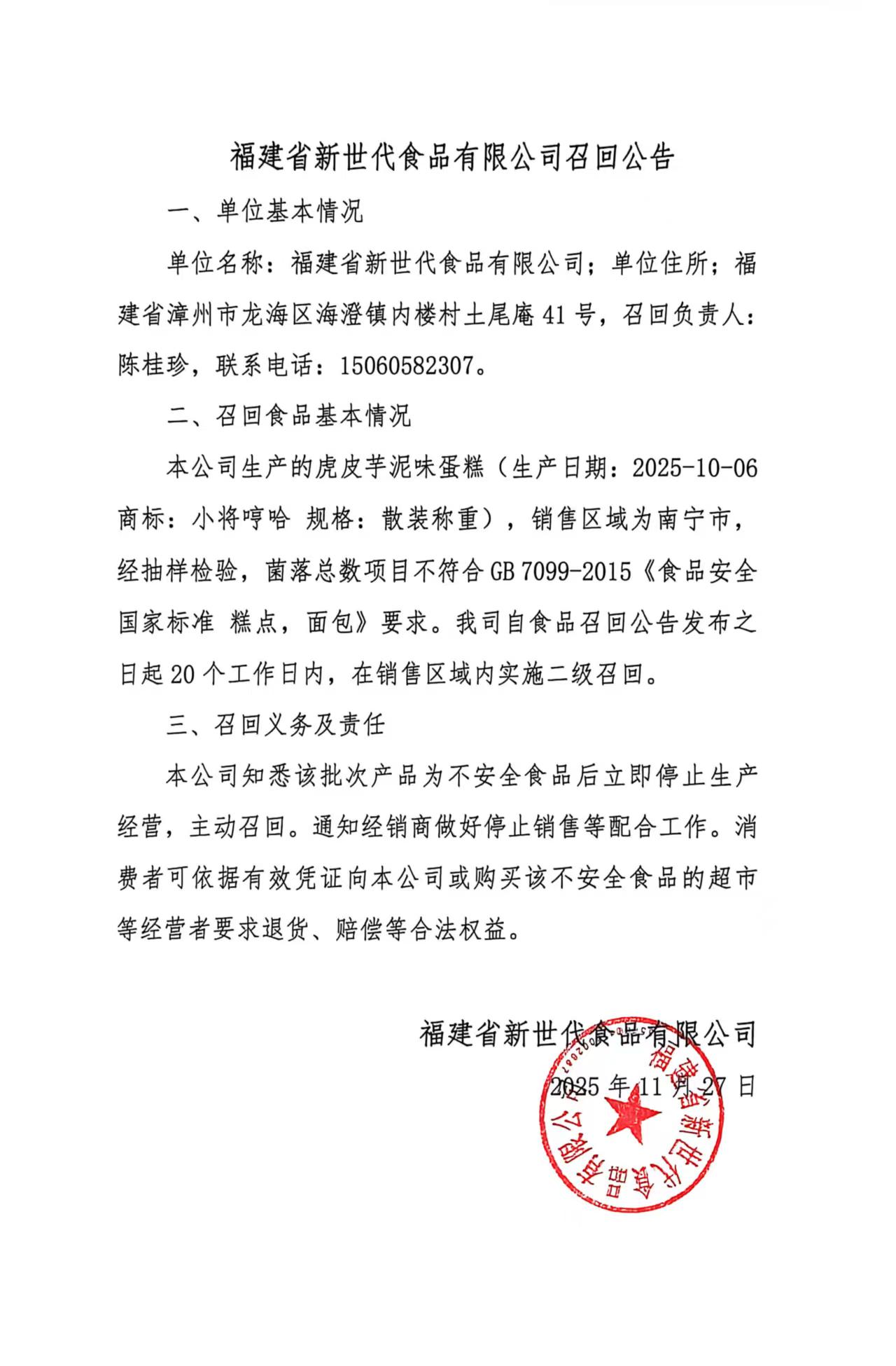 福建省新世代食品有限公司食品召回公告(虎皮芋泥味蛋糕20251006)(20251127)