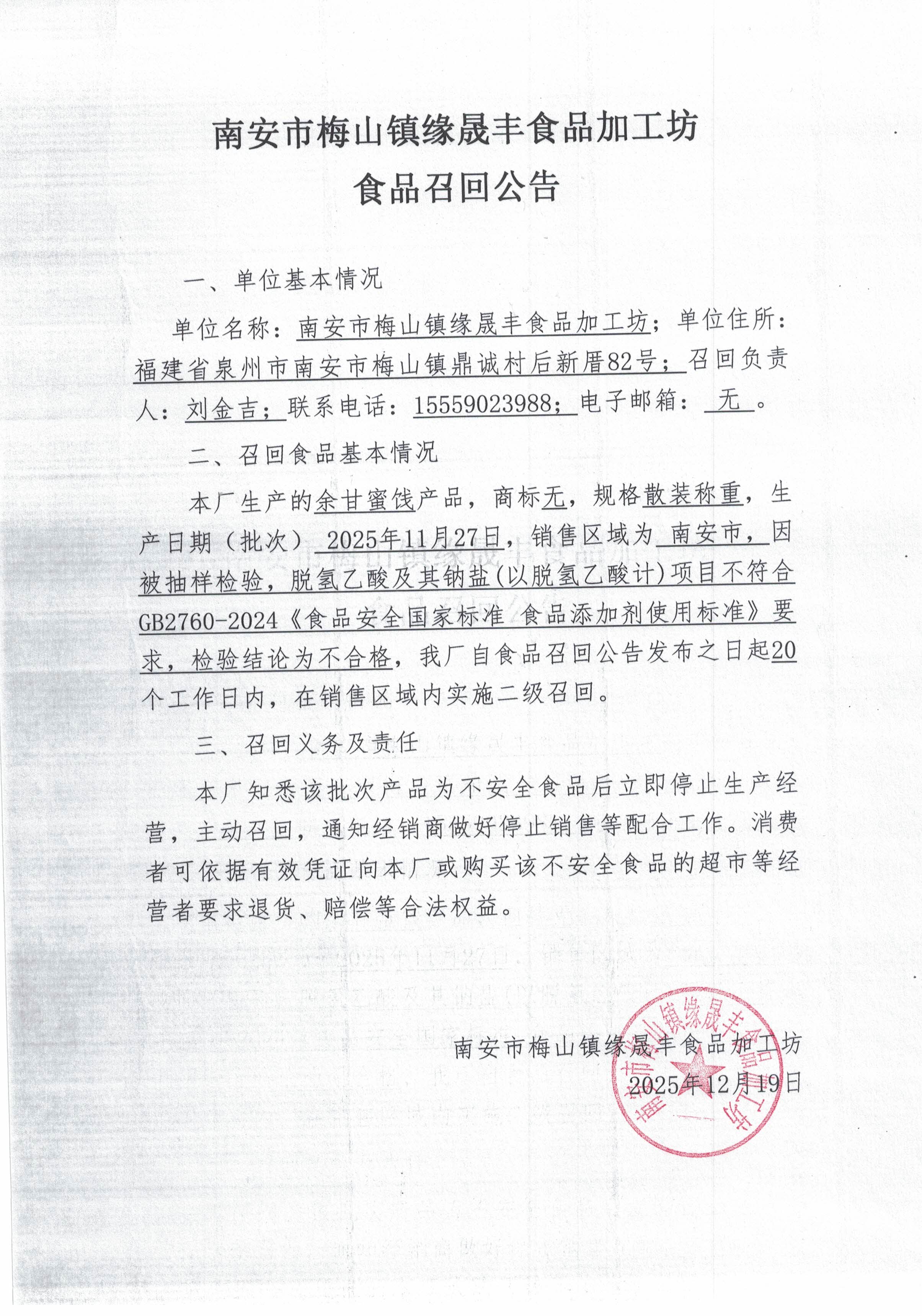南安市梅山鎮緣晟豐食品加工坊食品召回公告(20251219)