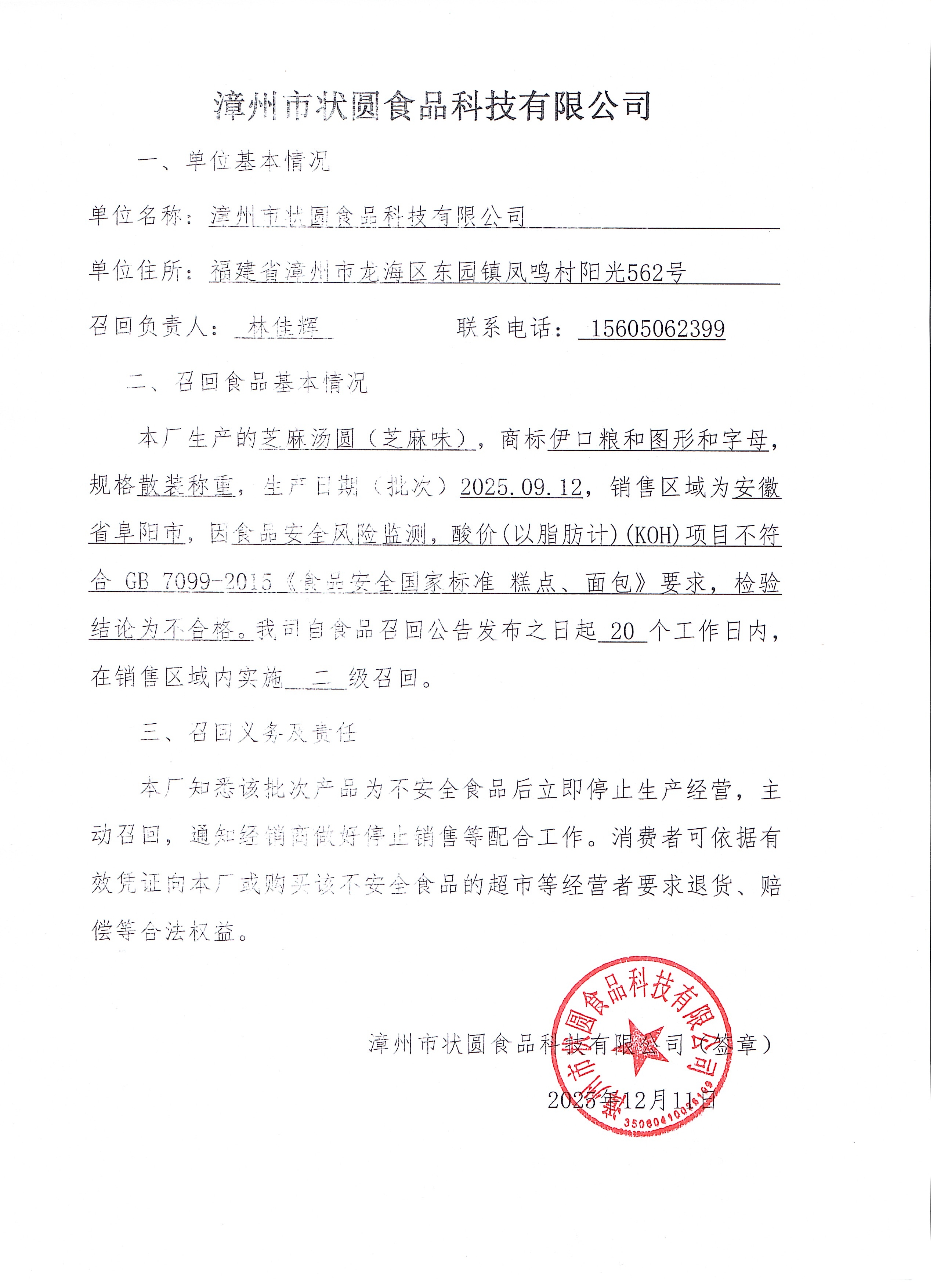 漳州市狀圓食品科技有限公司食品召回公告(芝麻湯圓(芝麻味)(20251211)