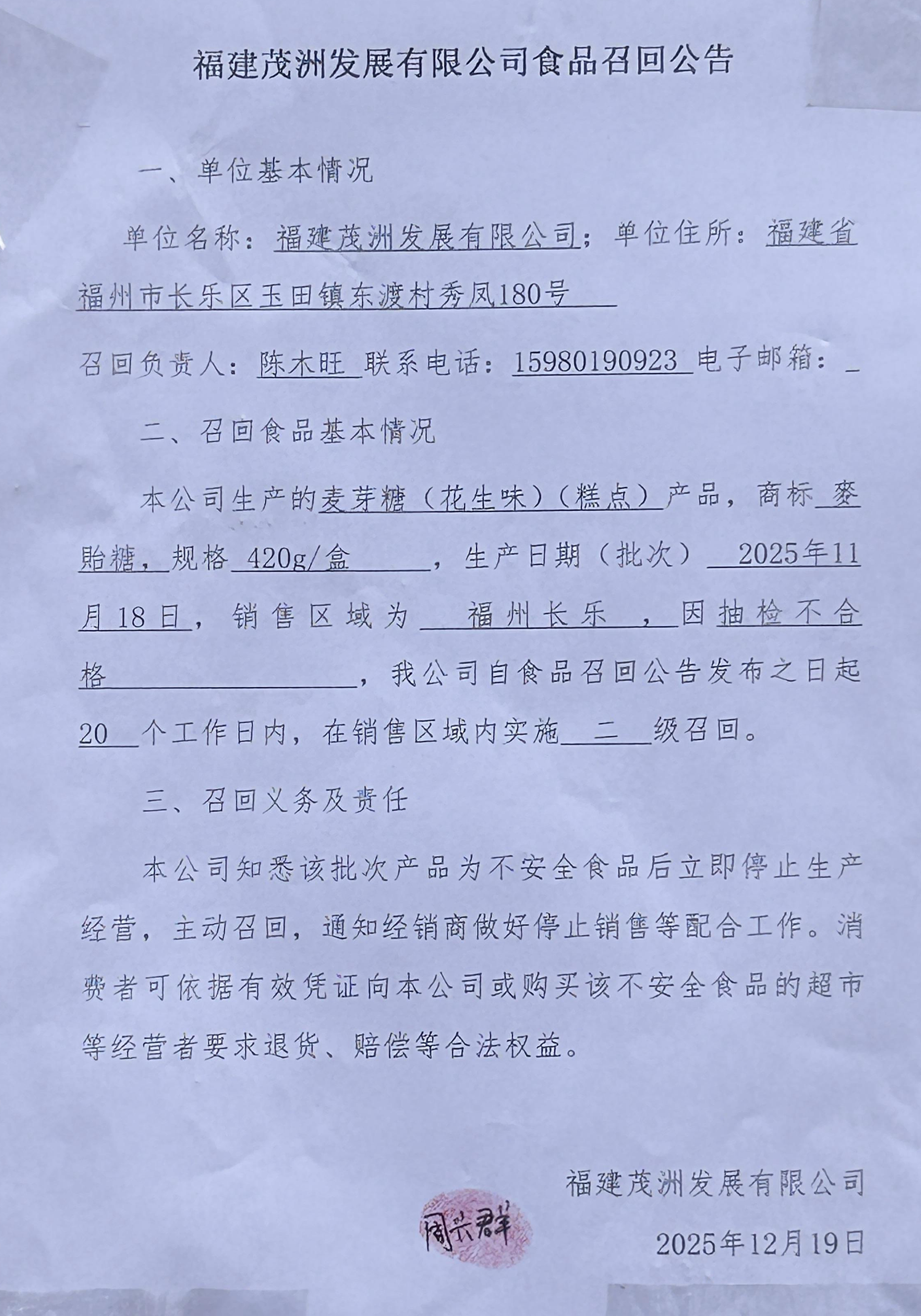 福建茂洲發展有限公司食品召回公告(20251219)