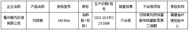 表2 福建省羽絨服裝產(chǎn)品質(zhì)量省級監(jiān)督抽查結(jié)果(不合格)