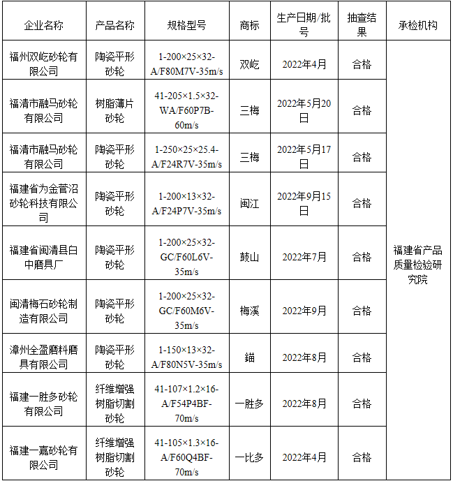 表1 福建省砂輪產品質量省級監督抽查結果(合格)