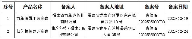 根據《中華人民共和國食品安全法》《保健食品注冊與備案管理辦法》(國家市場監督管理總局令第31號修訂),依據福建省力菲克藥業有限公司、仙芝科技(福建)股份有限公司申請,經研究,同意以上2家公司的2款國產保健食品產品(詳見表格)備案。